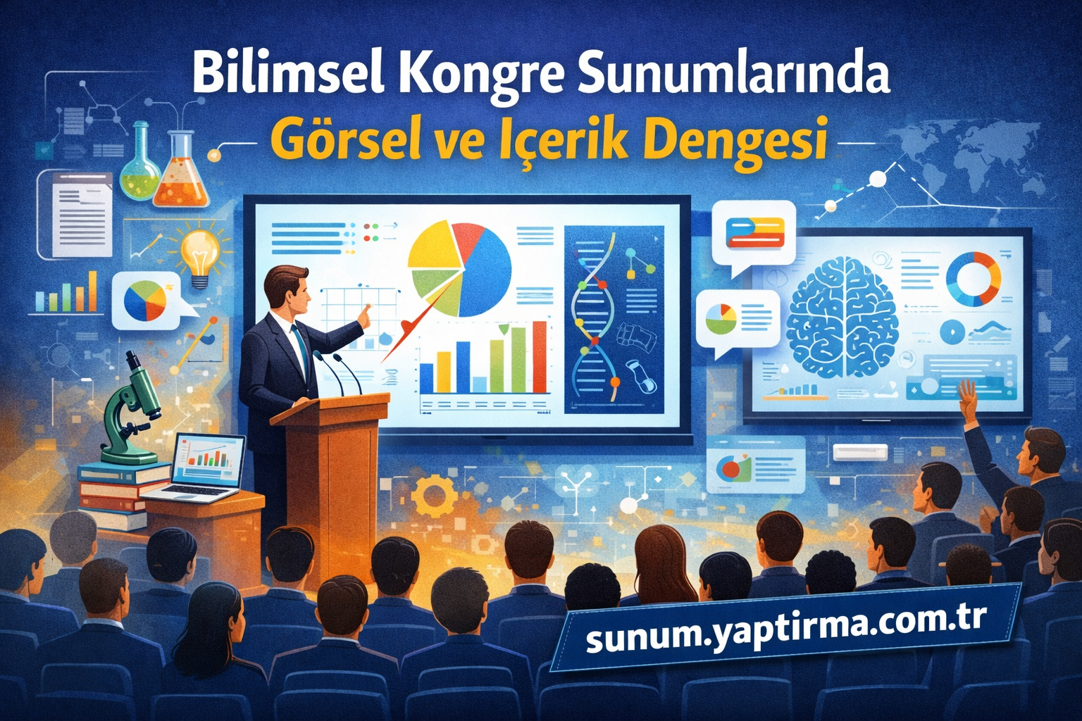 Akademik dünyada, bilimsel kongreler araştırmacıların çalışmalarını meslektaşlarıyla paylaştığı, geri bildirim aldığı, yeni iş birlikleri kurduğu ve alanındaki son gelişmeleri takip ettiği en önemli platformlardır. Bir kongrede yapacağınız sözlü sunum veya poster sunumu, aylar hatta yıllar süren emeğinizin bir özeti ve aynı zamanda bilimsel kimliğinizin bir yansımasıdır. Ancak, değerli bir araştırma bile, etkili bir şekilde sunulmadığında hak ettiği ilgiyi görmeyebilir. İşte bu noktada, bilimsel bir sunumda görsel ve içerik dengesini kurmak büyük önem taşır. Ne çok sade ne de aşırı karmaşık; ne sadece metin yığını ne de görsel şov; bilgiyi en etkili şekilde aktaran, akılda kalıcı ve izleyiciyi etkileyen bir sunum hazırlamak, başarılı bir kongre deneyiminin anahtarıdır. Bu makalede, bilimsel kongre sunumlarında görsel ve içerik dengesini nasıl kuracağınızı, etkili slaytlar hazırlamanın ipuçlarını, poster tasarımının püf noktalarını ve sunum becerilerinizi geliştirecek stratejileri kapsamlı bir şekilde ele alacağız. Siz de bilimsel sunumlarınızda profesyonel bir sunum desteği arıyorsanız, sunum danışmanlık hizmetimizden yararlanabilirsiniz.